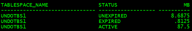 set lines 200 pages 200 col tablespace_name for a30select tablespace_name, status,sum(bytes)/1024/1024 MB from dba_undo_extentsgroup by tablespace_name,status;