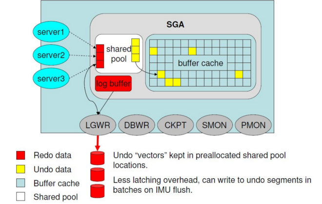 一个事务开始的时候,在shared pool中分一个IMU(in memory undo) buffer,将所有的回滚信息写到IMU buffer中