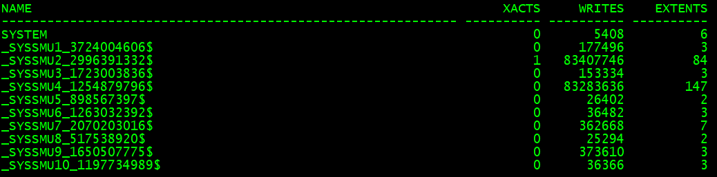 SELECT a.name, b.xacts, b.writes, b.extents FROM v$rollname a, v$rollstat b WHERE a.usn=b.usn;