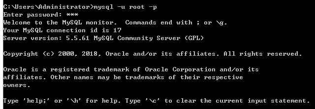 使用DOS命令进入MySQL:mysql -u root -p 按回车键输入密码显示如下界面成功进入MySQL交互界面。