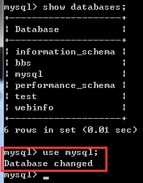 接下来,选择你想操作的数据库,使用语句:use mysql; (mysql为你想操作的数据库名)