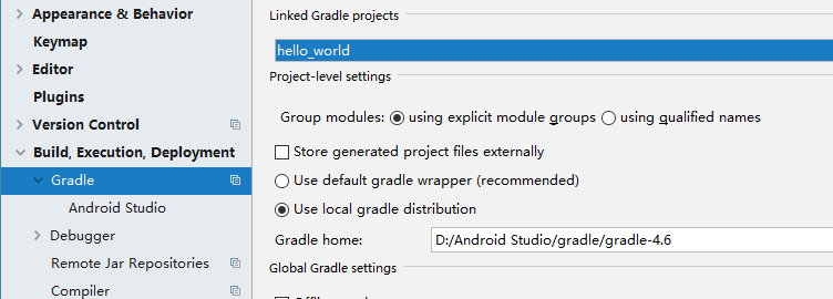 将gradle使用路径改为本地(如上位置),并确保该文件夹下有gradle-4.6文件夹。