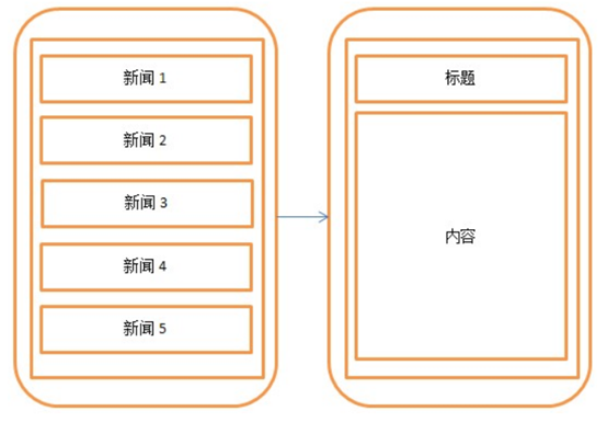 比如我们想做一个新闻应用,其中一个界面使用ListView展示了一组新闻的标题,当点击了其中一个标题,就打开另一个界面显示新闻的详细内容。如果是在手机竖屏时,我们可以将新闻标题列表放在一个Activity中,将新闻的详细内容放在另一个Activity中,如下图所示。