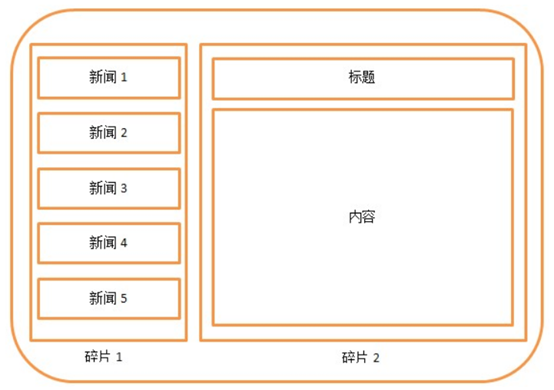 因此,更好的设计方案是将新闻标题列表界面和新闻详细内容界面分别放在两个Fragment中,然后在同一个Activity中引入这两个Fragment,如下图所示。