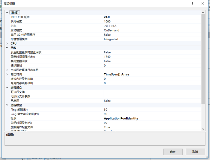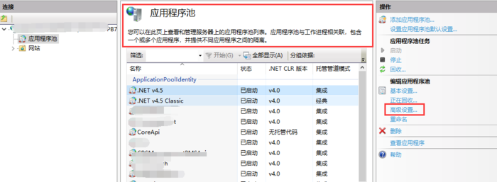 在应用程序池——高级设置中可以对应用程序池做相关设置,如队列长度,工作进程回收机制等。