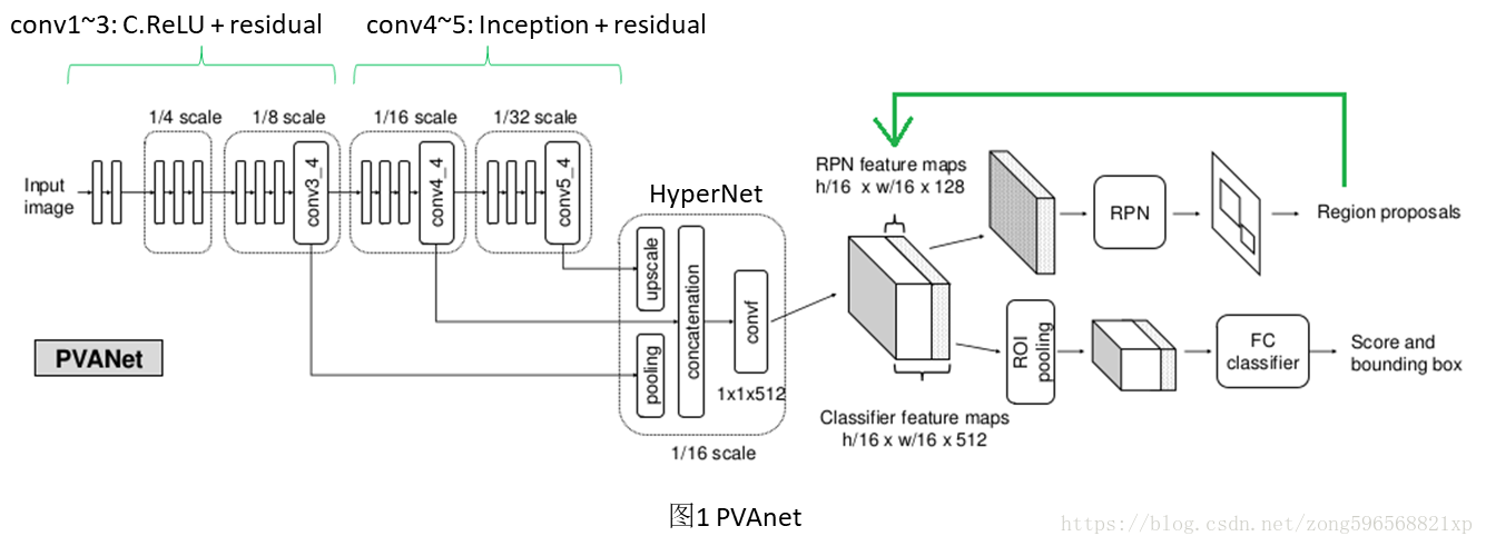 PVAnet是RCNN系列目标方向,基于Faster-RCNN进行改进,Faster-RCNN基础网络可以使用ZF、VGG、Resnet等,但精度与速度难以同时提高。PVAnet的含义应该为:Performance Vs Accuracy,意为加速模型性能,同时不丢失精度的含义。主要的工作再使用了高效的自己设计的基础网络。该网络使用了C.ReLU、Inception、HyperNet以及residual模块等技巧。整体网络结构如图1所示。