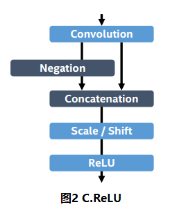 C.ReLU的作者观察基础网络卷积层参数,发现低层卷积核成对出现(参数互为相反数),因此,作者减小输出特征图个数为原始一半,另一半直接取相反数得到,再将两部分特征图连接,从而减少了卷积核数目。关于C.ReLU参考博客与论文。C.ReLU的模块结构如图2所示。