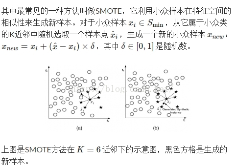 Borderline-SMOTE的解决思路是寻找那些应该为之合成新样本的小众样本。即为每个小众样本计算K近邻,只为那些K近邻中有一半以上大众样本的小众样本生成新样本。直观地讲,只为那些周围大部分是大众样本的小众样本生成新样本,因为这些样本往往是边界样本。确定了为哪些小众样本生成新样本后再利用SMOTE生成新样本。