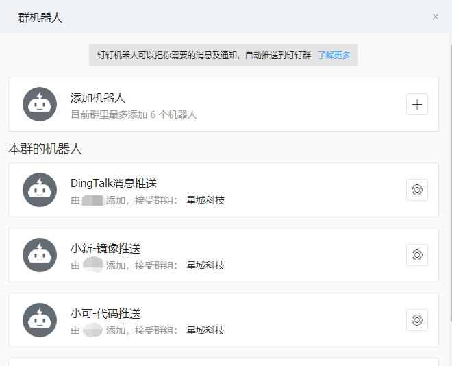首先得有一个钉钉群,如果没有得自行创建一个了,通过群内右上角菜单中找到群机器人然后添加一个自定义机器人
