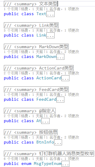 }通过分析五种消息类型,其中的一些参数可以完成共用,对自定义钉钉机器人文档的一系列挖掘后,确定了这几个类和枚举