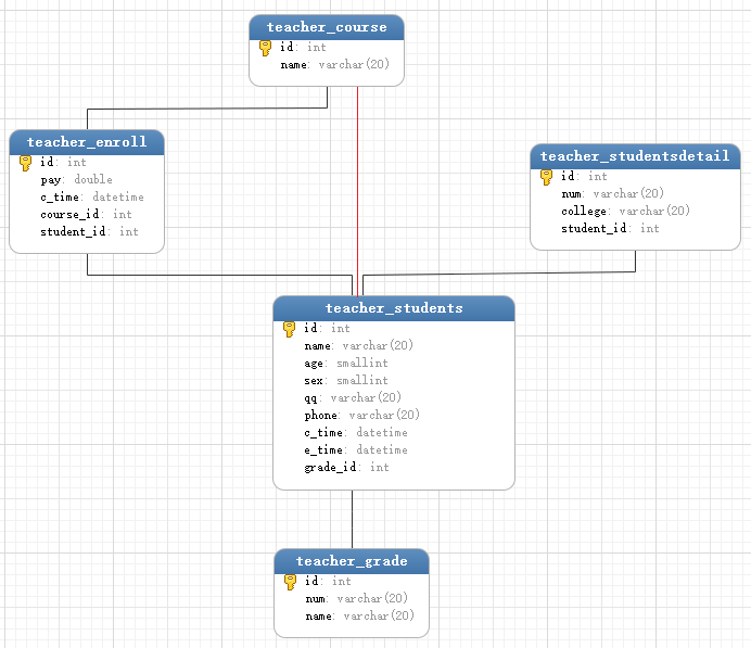 >>> res = Grade.objects.filter(students__course__name__contains='python') 通过学生表去查课程名称之后,>>> print(res.query) SELECT `teacher_grade`.`id`, `teacher_grade`.`num`, `teacher_grade`.`name` FROM `teacher_grade` INNER JOIN `teacher_students` ON (`teacher_grade`.`id` = `teacher_students`.`grade_id`) INNER JOIN `teacher_enroll` ON (`teacher_students`.`id` = `teacher_enroll`.`student_id`) INNER JOIN `teacher_course` ON (`teacher_enroll`.`course_id` = `teacher_course`.`id`) WHERE `teacher_course`.`name` LIKE BINARY %python%