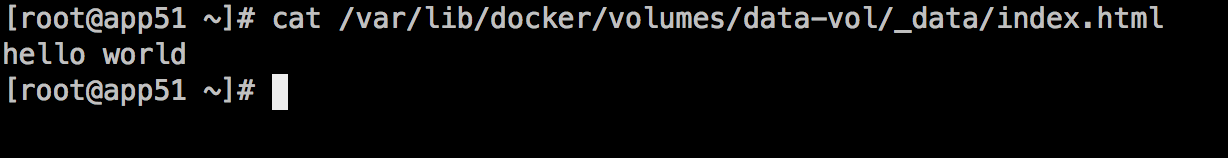 [root@app51 ~]# docker run -it --name bs1 -v data-vol:/data/tmp busybox:latest /bin/sh/ # ls /data/tmp// # echo "hello world" > /data/tmp/index.html / #