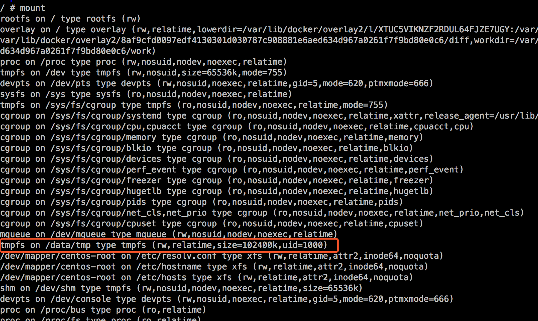 [root@app51 ~]# docker run -it --name tmpfs-c3 --mount type=tmpfs,dst=/data/tmp,tmpfs-mode=1770,tmpfs-size=50m busybox:latest /bin/sh/ # / # / # momodinfo modprobe more mount mountpoint/ # mount |grep /data/tmptmpfs on /data/tmp type tmpfs (rw,nosuid,nodev,noexec,relatime,size=51200k,mode=1770)/ # ls /data/ -ltotal 0 drwxrwx--T 2 root root 40 Mar 1 01:47 tmp