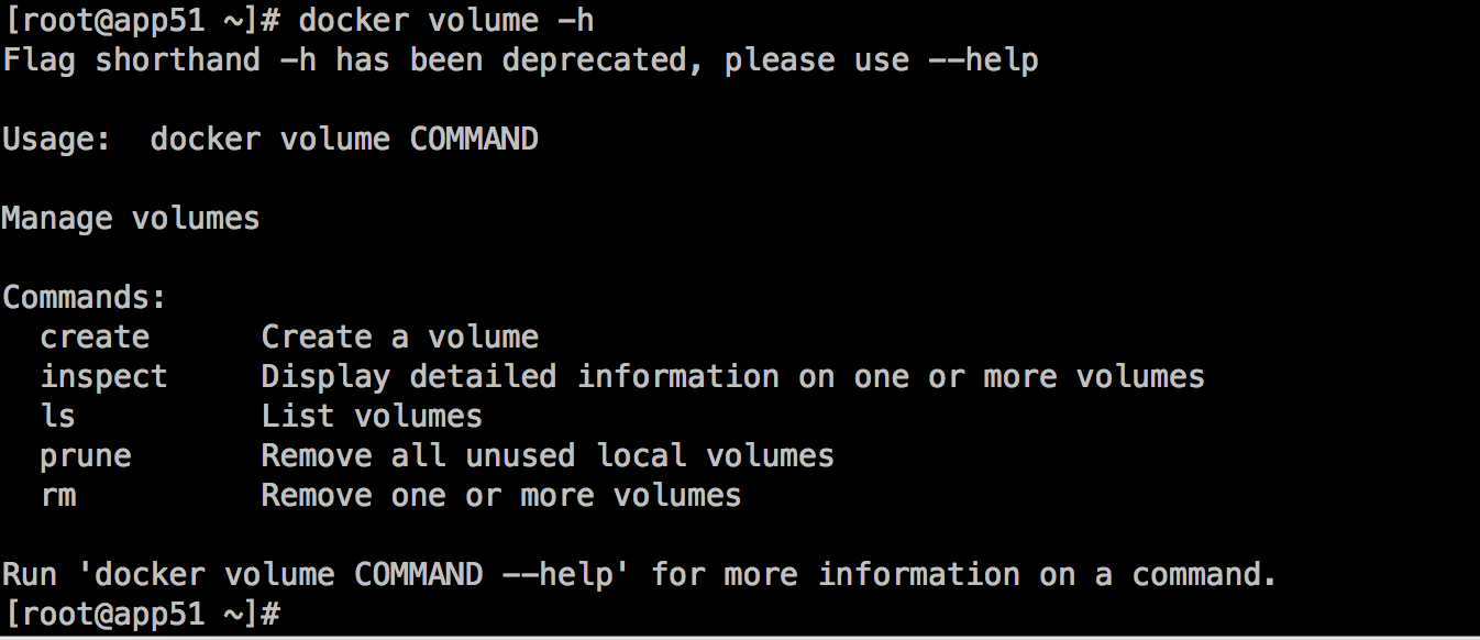 [root@app51 ~]# docker volume ls DRIVER VOLUME NAME local test-vol-1local test-vol-2local test-vol-3[root@app51 ~]#
