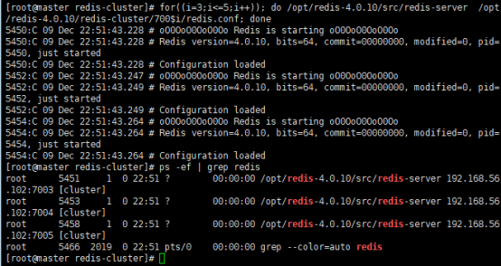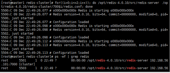 # 第一台机器上执行 3个节点for((i=0;i<=2;i++)); do /opt/redis-4.0.10/src/redis-server /opt/redis-4.0.10/redis-cluster/700$i/redis.conf; done # 第二台机器上执行 3个节点for((i=3;i<=5;i++)); do /opt/redis-4.0.10/src/redis-server /opt/redis-4.0.10/redis-cluster/700$i/redis.conf; done # 启动单个节点示例/opt/redis-4.0.10/src/redis-server /opt/redis-4.0.10/redis-cluster/7000/redis.conf