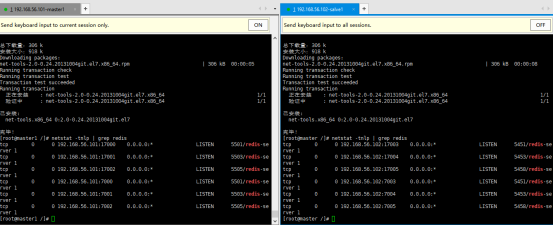 [root@master1 /]# /opt/redis-4.0.10/src/redis-trib.rb create --replicas 1 192.168.56.101:7000 192.168.56.101:7001 192.168.56.101:7002 192.168.56.102:7003 192.168.56.102:7004 192.168.56.102:7005 >>> Creating cluster>>> Performing hash slots allocation on 6 nodes... Using 3 masters:192.168.56.101:7000 192.168.56.102:7003 192.168.56.101:7001Adding replica 192.168.56.102:7005 to 192.168.56.101:7000Adding replica 192.168.56.101:7002 to 192.168.56.102:7003Adding replica 192.168.56.102:7004 to 192.168.56.101:7001M: 6af67c2741b3001e6d328621ac8a2e539b65d683 192.168.56.101:7000 slots:0-5460 (5461 slots) master M: e2f298953141f46b255b0f35372af917afc16205 192.168.56.101:7001 slots:10923-16383 (5461 slots) master S: 3516ed59324a7421878b2c17aba44d91ec7e9439 192.168.56.101:7002 replicates ab5b4535f3382c13d7afb91d005e8a87d830eb46 M: ab5b4535f3382c13d7afb91d005e8a87d830eb46 192.168.56.102:7003 slots:5461-10922 (5462 slots) master S: 16822c6d58461f9edaf965aa53efdac59d1adce5 192.168.56.102:7004 replicates e2f298953141f46b255b0f35372af917afc16205 S: c00dea4a44e01e1f17b29f7b3b95e0c57b06a653 192.168.56.102:7005 replicates 6af67c2741b3001e6d328621ac8a2e539b65d683 Can I set the above configuration? (type 'yes' to accept): yes