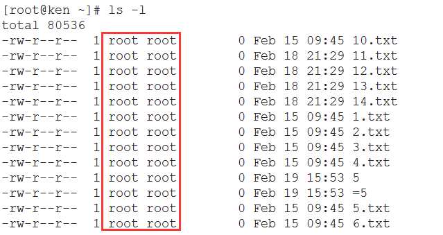 这两项信息在文档创建的时候会使用创建者的信息(用户名放在前面的root、用户所属的主组名称放在后面的root)。