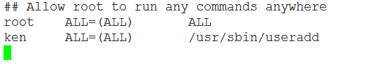 案例:创建ken用户,本身ken用户不能添加用户,要求使用sudo配置,将其设置为可以添加用户。
