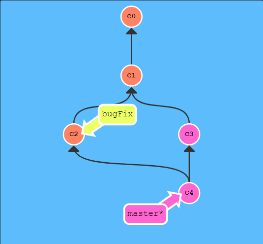 哇哦!看见了吗?首先,master 现在指向了一个拥有两个父节点的提交记录。假如从 master 开始沿着箭头向上看,在到达起点的路上会经过所有的提交记录。这意味着 master 包含了对代码库的所有修改。