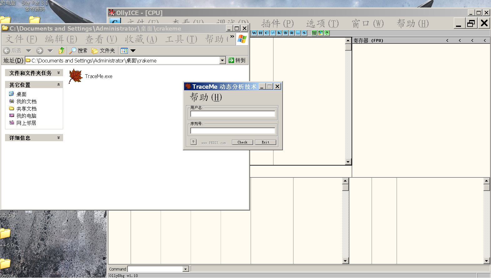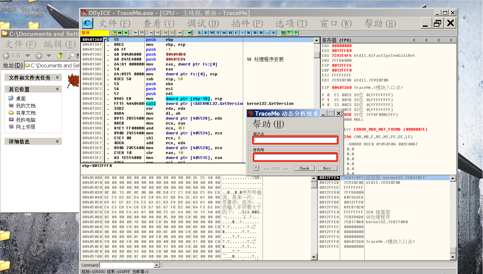 随便输入用户名和序列号,check:然后F8单步进行到如下;