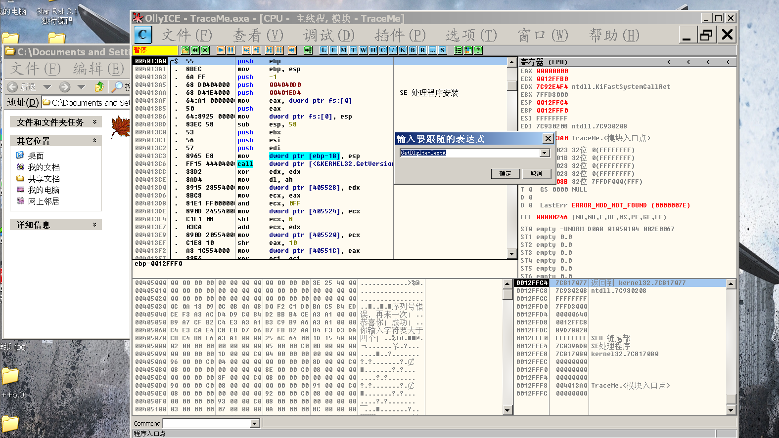 CTRL+G调用表达式:(这里由于不知道它使用的哪种函数,需要一一调试,输错就没有调用该函数,这里是需要耐心的,逆向工程都是在耐心中完成的):