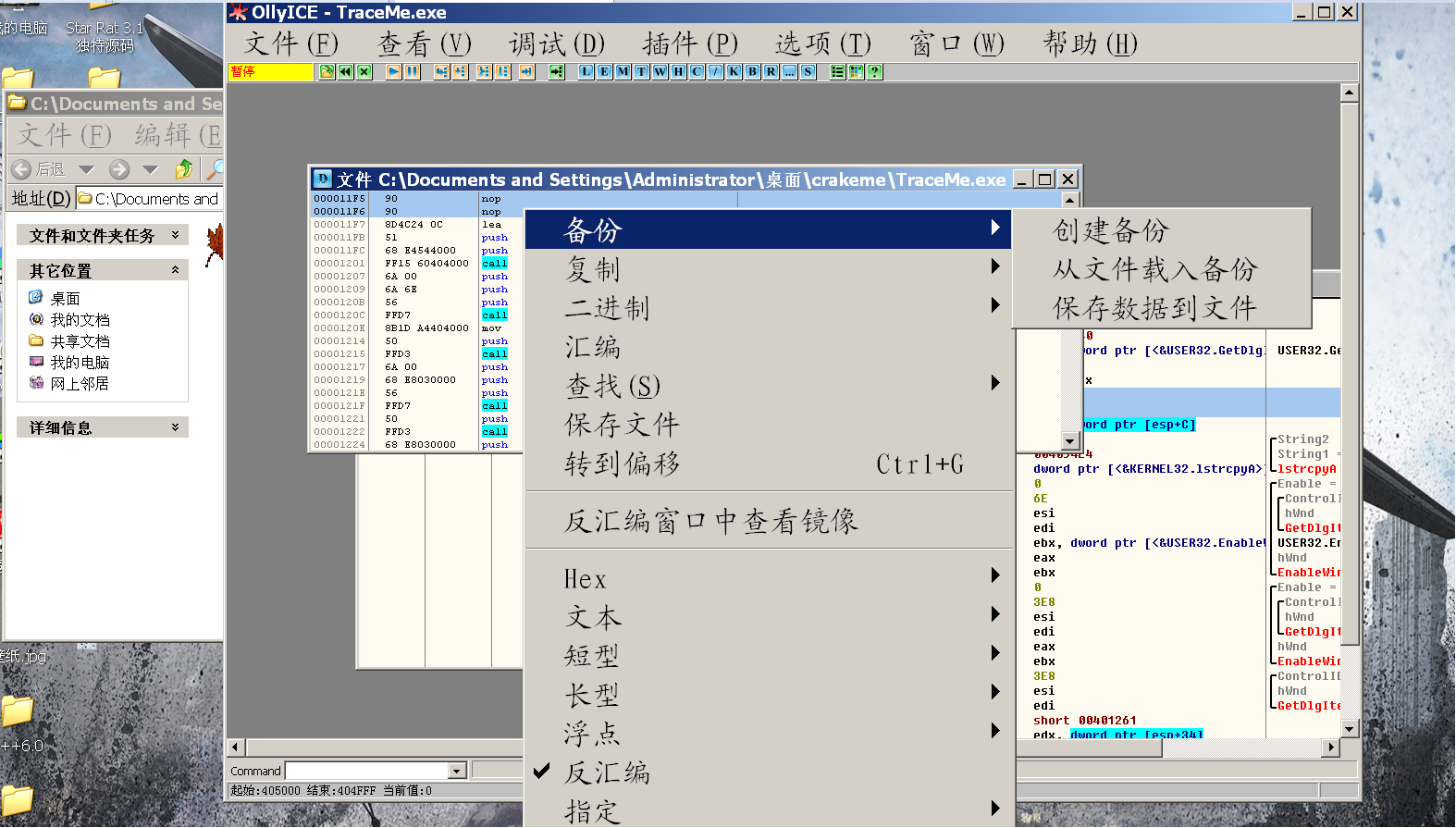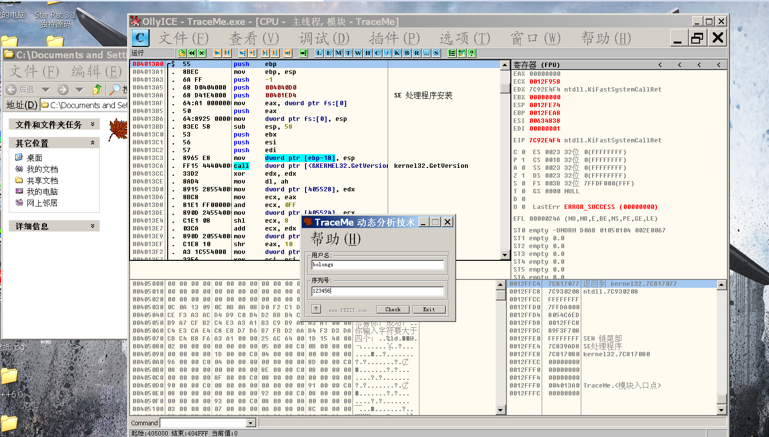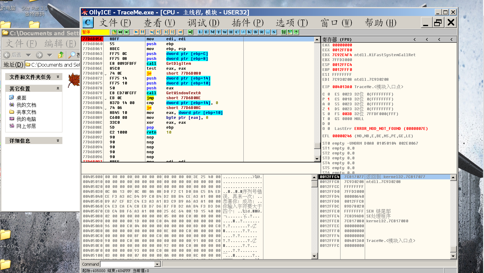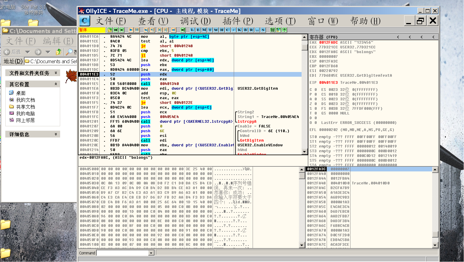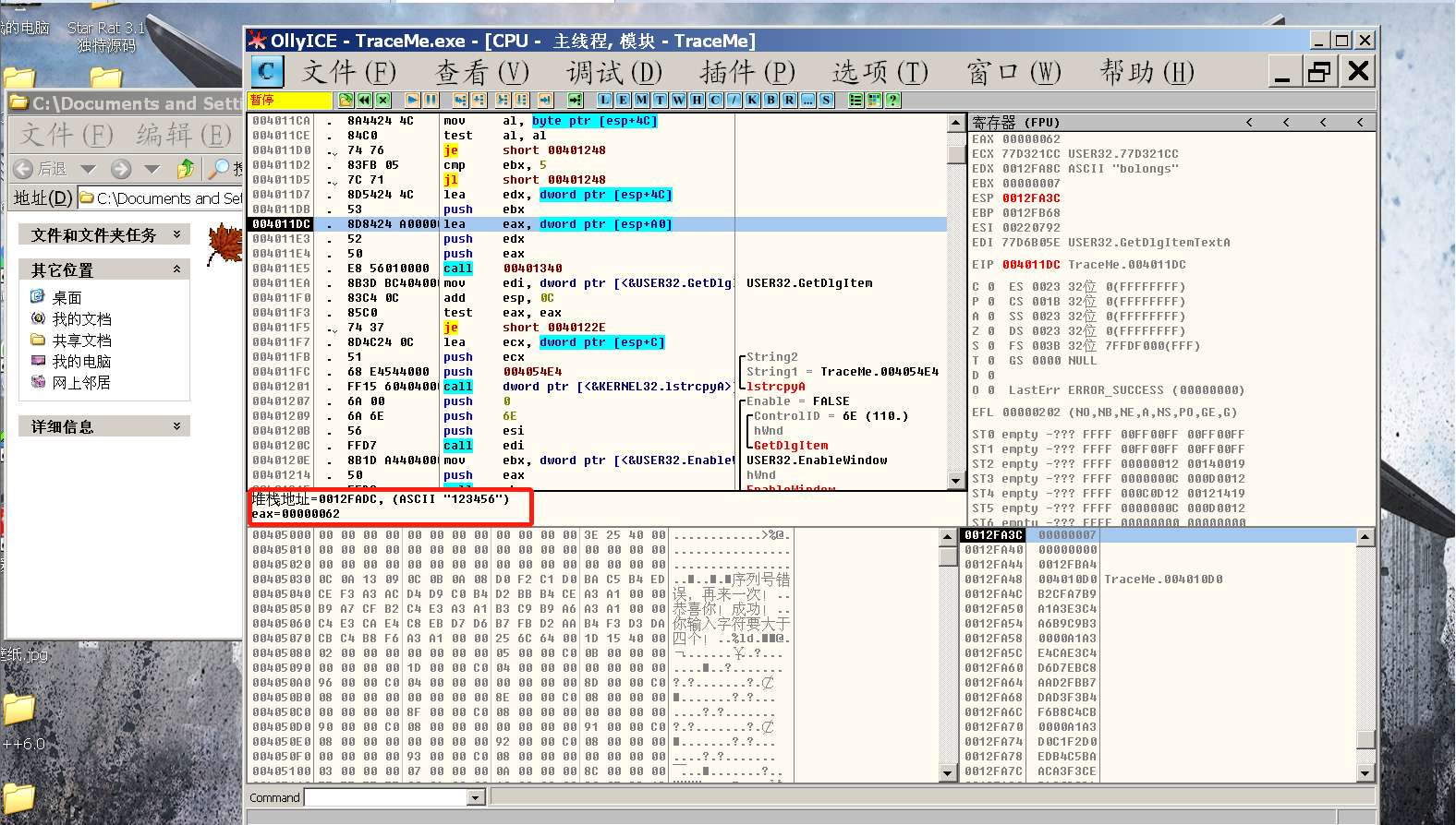 可以发现在这里调用了 GetDlgItemTextA,按 F2 下一个断点,然后CTRL+F2进行重加载,F9运行: