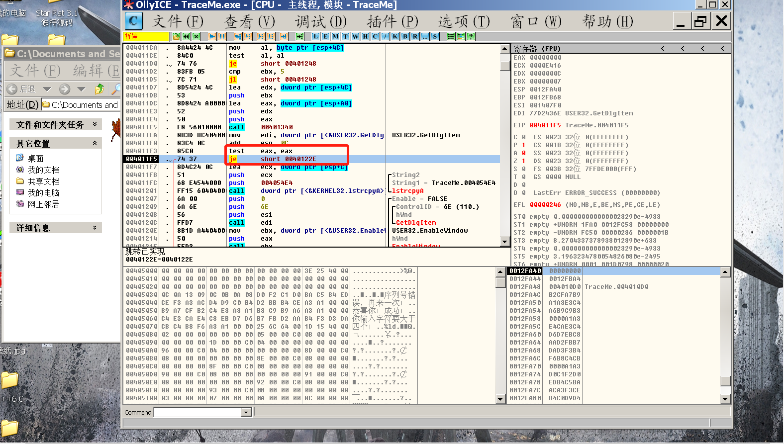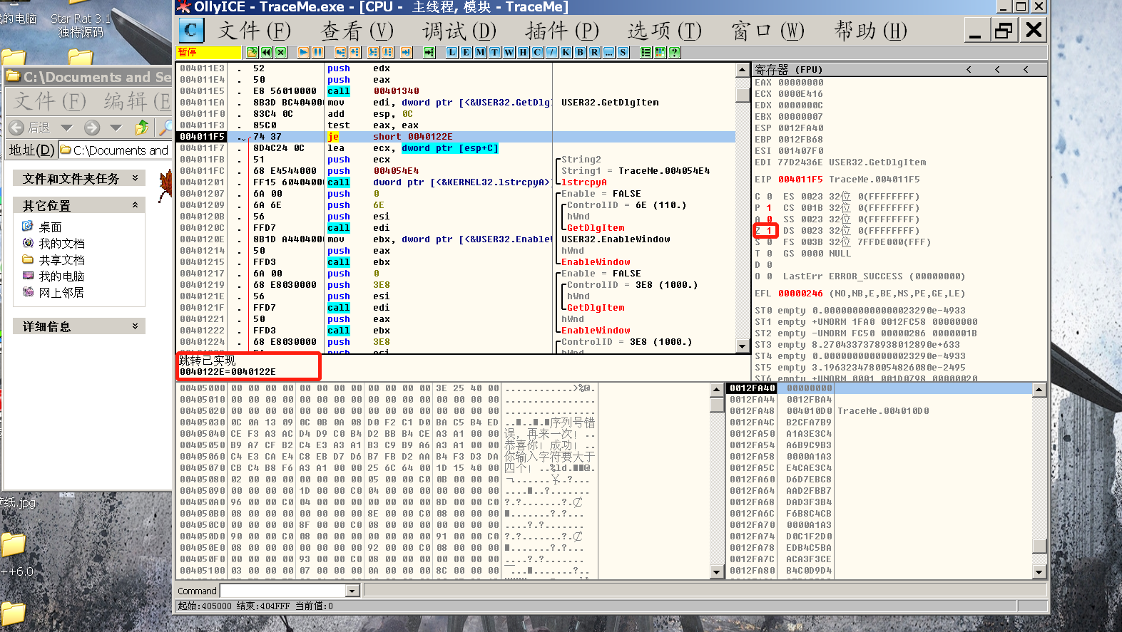 这里出现了test函数,意思是测试序列号和用户名是否符合要求,eax是寄存器的函数的意思,大一上学期的时候应该有了解过一点,win32系统一定会把文本转换为32位存在eax中,je是汇编函数的一个跳转函数,判断条件是ZF=1时就跳转,