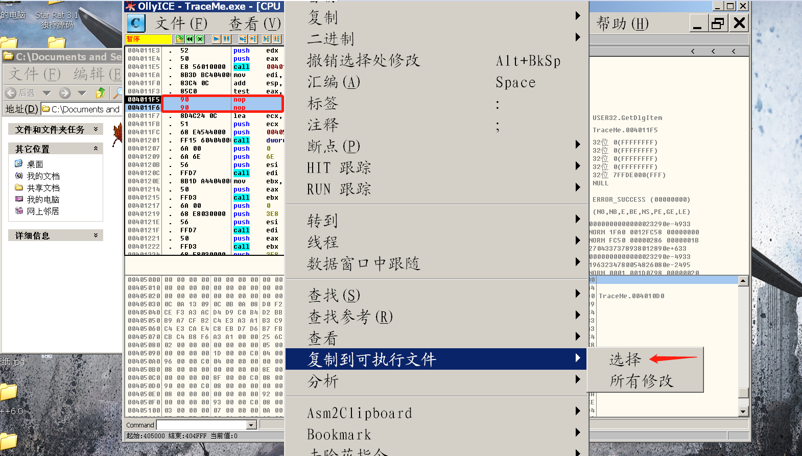 而这里我们可以修改值,将eax寄存器的值修改,或者修改je函数,让1为0,成为False,跳转不实现,因为我们不知道正确的序列号,这是跳转一定会指向错误的,或者强制填充nop函数