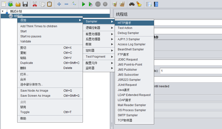线程组-->添加-->Sampler-->HTTP请求