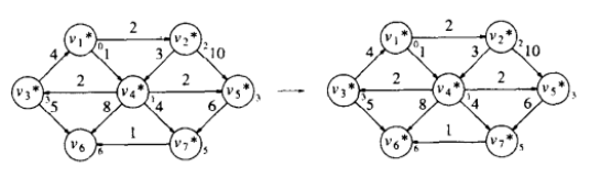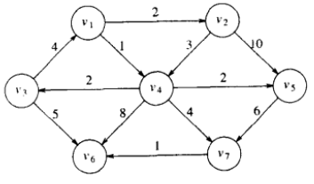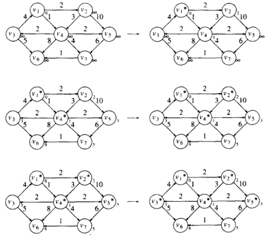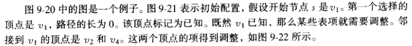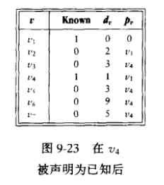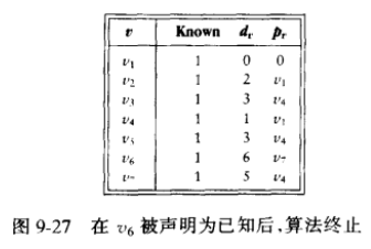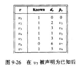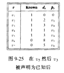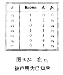 算法:以下面这个加权有向图为例,并假设开始结点为v1。初始配置如图9-12所示。每次更新下图的表格,算法都会选择未知的点中dv最小的一个标记为已知,然后去寻找这个点的下几个邻接点,如果该邻接点到这个已知点的距离加上这个已知点的dv小于该邻接点的dv,那么更新dv和pv,这其实就是从这个已知点这里走会更近的意思;如果该邻接点是已知的就跳过(因为每一次都是先将dv最小的点标记为已知,所以该点的dv不会更小)。