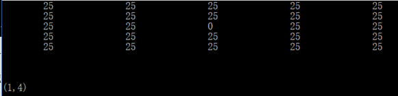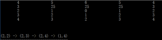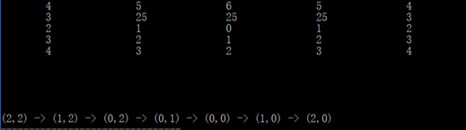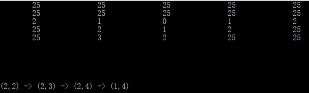 图中二维数组打印了各个坐标点的value,即该点到起点的最短路径。25为墙,0为起点。可以看到到终点需要六步,路径是先往左,再往上,左后向右到终点。