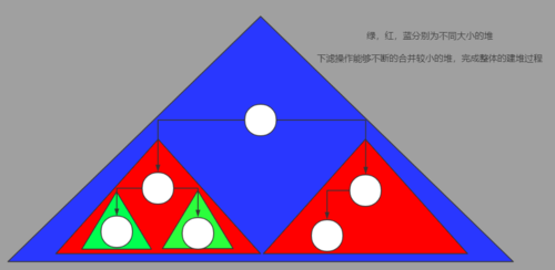 但还存在一种效率更加高效的批量建堆算法,是以下滤操作为基础实现的,被称为Floyd建堆算法。下滤操作可以看做是将两个较小的堆合并为一个更大堆的过程(单个元素可以被视为一个最小的堆),通过从底到高不断的下滤操作,原本无序的元素集合将通过不断的合并建立较小的堆,最终完成整个集合的建堆过程。