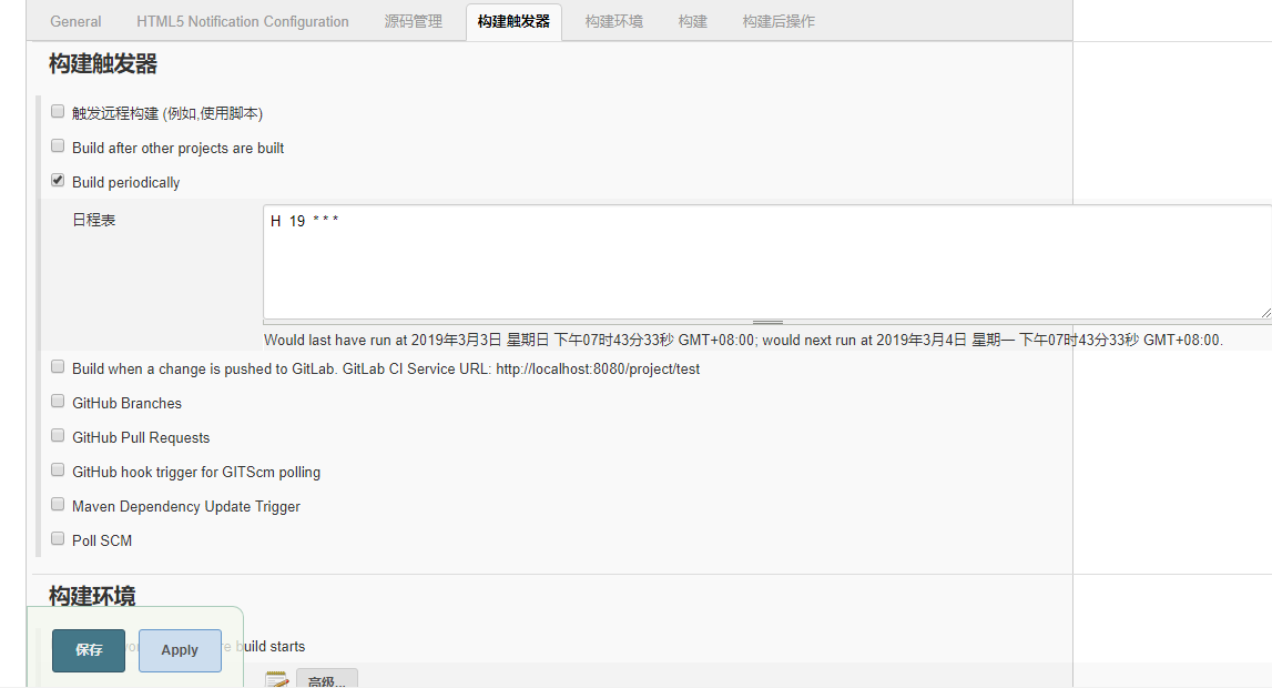 2.选择构建触发器,根据时间点,每天到点进行自动触发构建