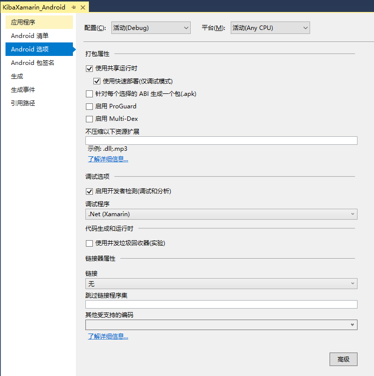 使用共享运行时:在开发调试阶段需要将该选项勾选上,不然会出现无法部署到Emulator模拟器上的情况。