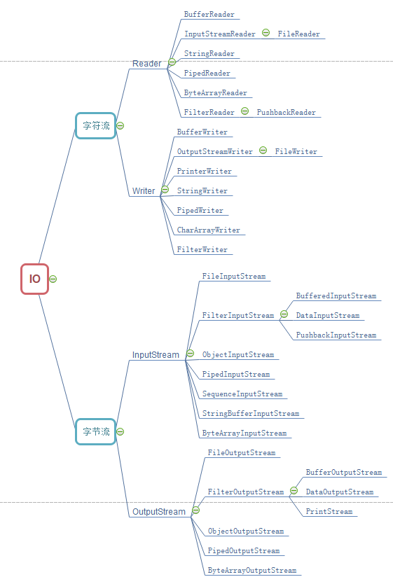 IO从种类上,一般划分为字符流和字节流两大类,其中,字符流是以Reader或Writer结尾的,如InputStreamReader,