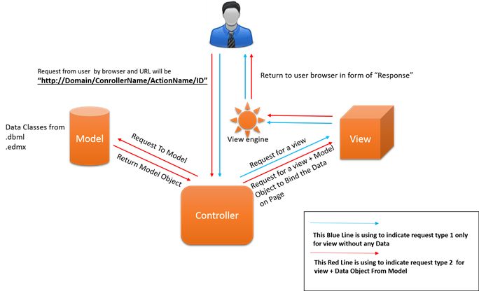 1.第一种请求是:返回一个视图,没有对模型数据进行请求。这个时候是用户发送一个请求,被MVC处理程序处理,然后直接到到控制器,然后调用控制器的某个HttpGet特性标识的方法中,然后返回一个ViewResult实例,然后找到相应的视图页面,视图引擎就渲染视图页面,呈现给用户HTML页面。