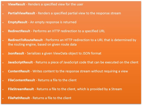一个Action方法,可能有多种返回值类型。我们可以返回多种类型的返回值给用户,但是大多数的时候,还是使用ActionResult,因为它是其他类型的父类。