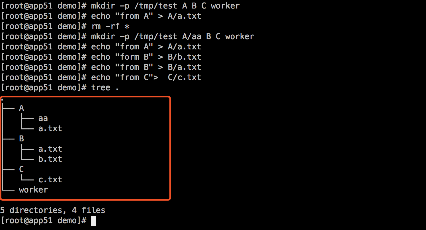 创建三个目录A、B、C,以及worker目录: