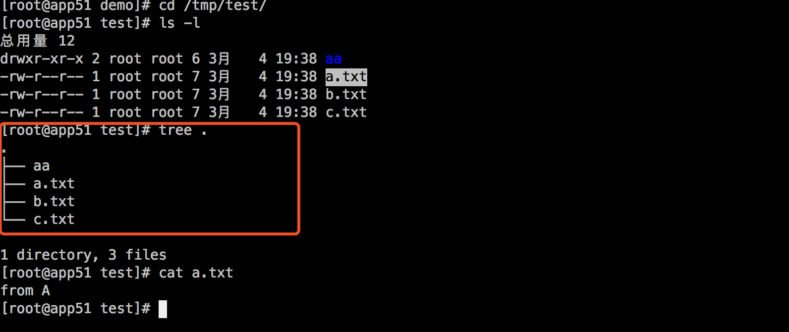 然后我们再去查看/tmp/test目录,你会发现目录A、B、C被合并到了一起,并且相同文件名的文件会进行“覆盖”,这里覆盖并不是真正的覆盖,而是当合并时候目录中两个文件名称都相同时,merged层目录会显示离它最近层的文件: