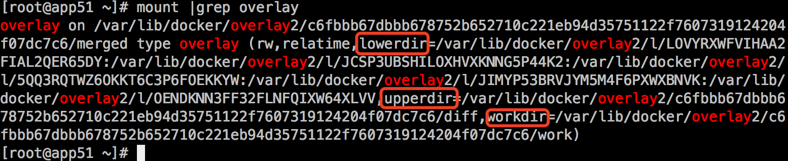 查看其overlay挂载点,可以发现其挂载的merged目录、lowerdir、upperdir以及workdir: