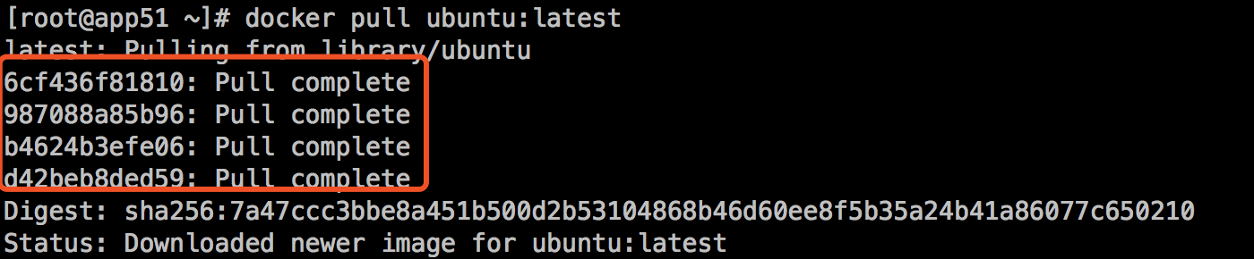 从仓库pull一个ubuntu镜像,结果显示总共拉取了4层镜像如下: