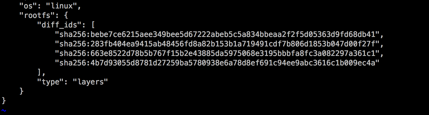 查看其对应的元数据(使用vim :%!python -m json.tool格式化成json) 截取了其rootfs的构成: