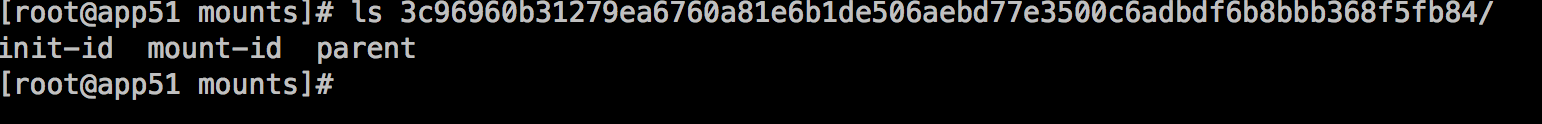 mountedLayer 信息存储的可读init层以及容器挂载点信息包括:容器 init 层ID(init-id)、联合挂载使用的ID(mount-id)以及容器层的父层镜像的 chainID(parent)。相关文件位于/var/lib/docker/image/<storage_driver>/layerdb/mounts/<container_id>/ 目录下。