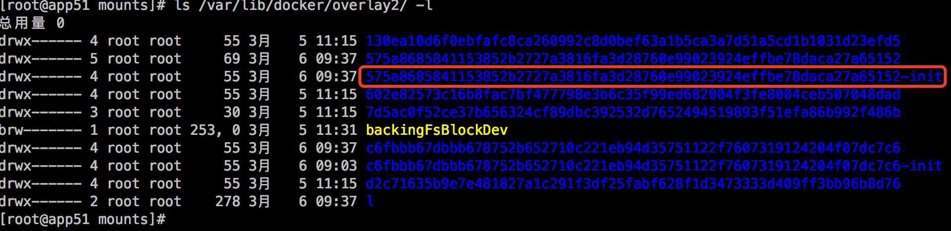 可以看到initID是在mountID后加了一个-init,同时initID就是存储在/var/lib/docker/overlay2/的目录名称: