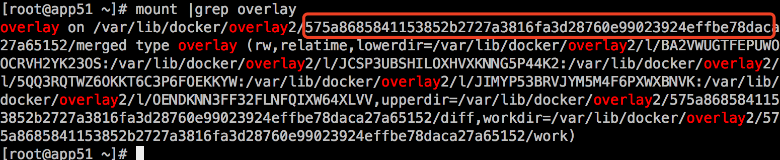 查看mountID还可以直接通过mount命令查看对应挂载的mountID,对应着/var/lib/docker/overlay2/目录,这也是overlayfs呈现的merged目录: