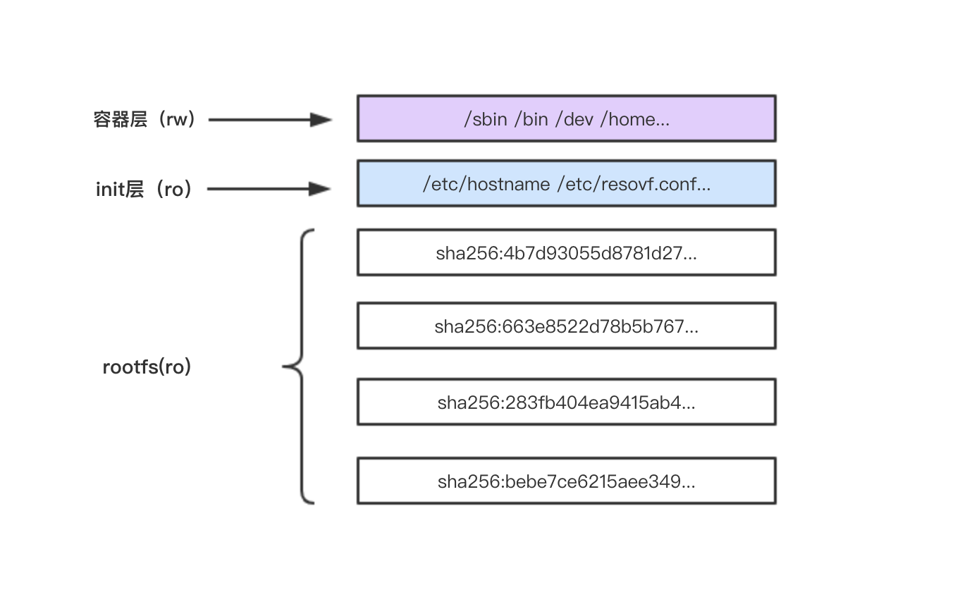 init层是以一个uuid+-init结尾表示,夹在只读层和读写层之间,作用是专门存放/etc/hosts、/etc/resolv.conf等信息,需要这一层的原因是当容器启动时候,这些本该属于image层的文件或目录,比如hostname,用户需要修改,但是image层又不允许修改,所以启动时候通过单独挂载一层init层,通过修改init层中的文件达到修改这些文件目的。而这些修改往往只读当前容器生效,而在docker commit提交为镜像时候,并不会将init层提交。该层文件存放的目录为/var/lib/docker/overlay2/<init_id>/diff