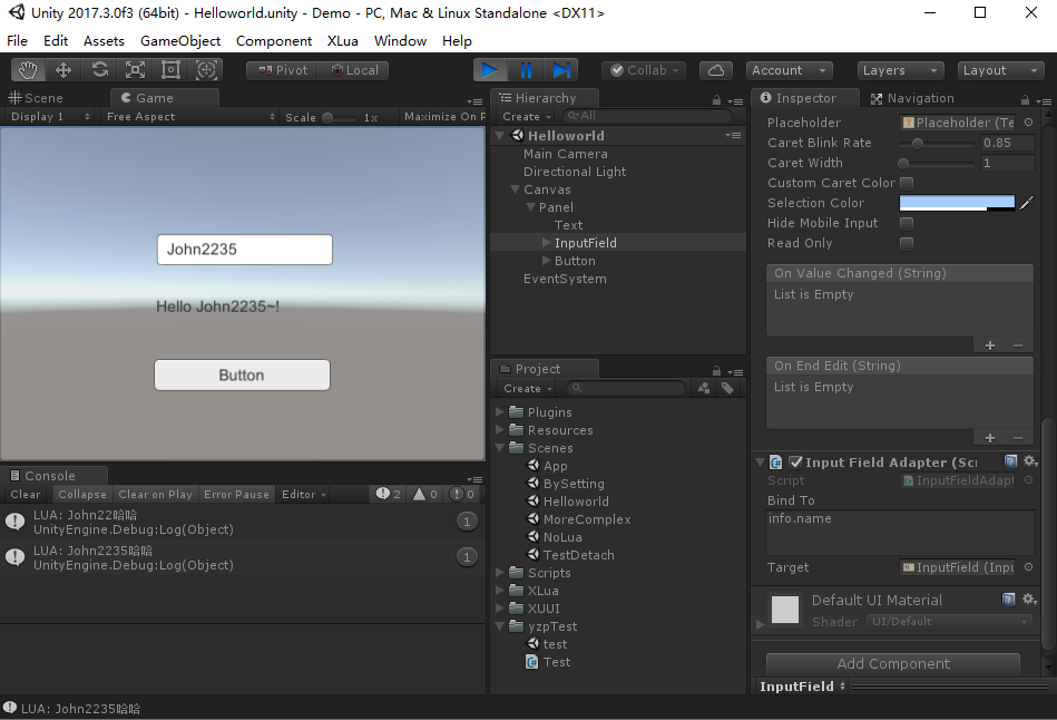 下载项目到本地,可以看到作者提供了几个使用示例。使用时要设置好绑定信息,给各个UI元素(比如Button、Text、InputField等)添加适配器,可以通过Component/XUUI菜单或者手动到XUUI\Scripts\UGUIAdapter目录找脚本拖放到UI上,然后设置BindTo属性即可,XUUI作者已经提供了Button、Text、Dropdown、InputField的适配器,其他ui元素比如Toggle就需要自己去编写了,作者已经提供了接口模板,自己实现其他适配器也不难。先来看一下Helloworld示例: