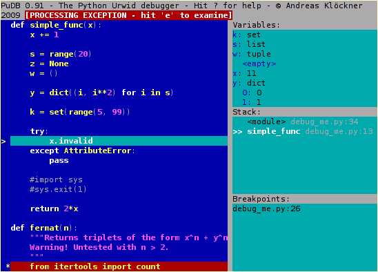 如果你觉得这样太原始,那么可以尝试pudb,它是基于控制台的debug图形化debugger工具,稍微比pdb直观一点,但仅可以在Linux下运行。