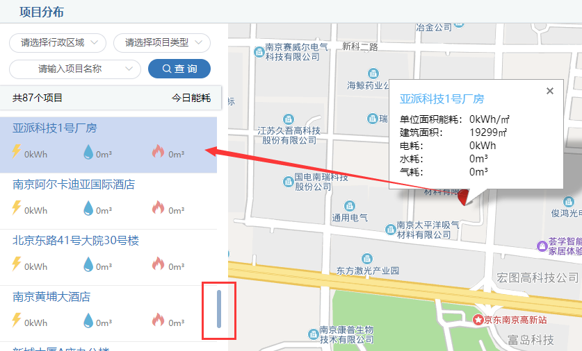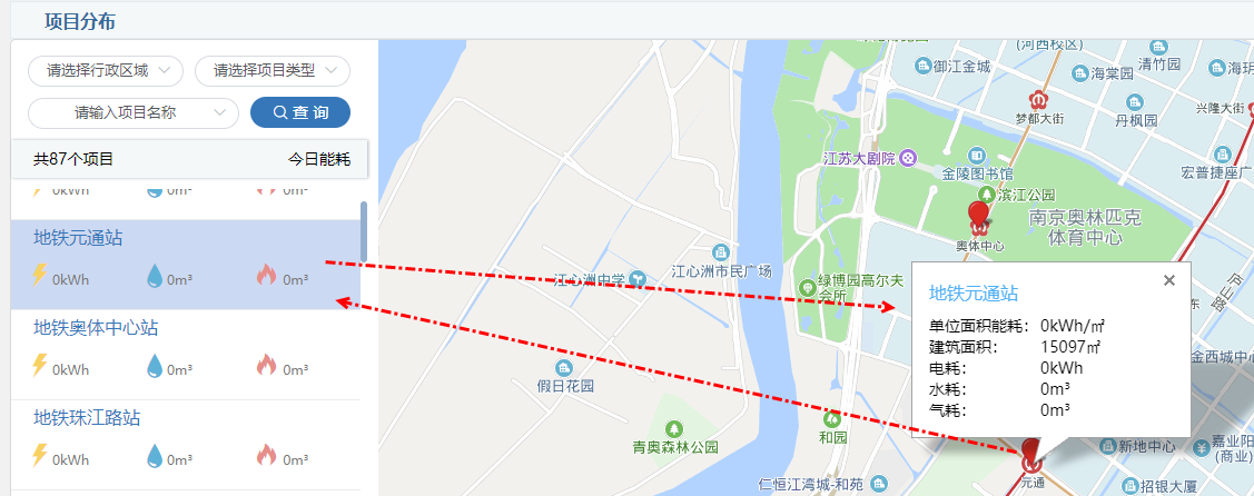交互:选中左侧的项目,选中项高亮,自动定位到右侧地图中项目所在位置,并弹出项目的基本信息。点击右侧的项目,自动高亮显示左侧的项目,并滚动到项目所在位置。地图支持聚合和缩放。