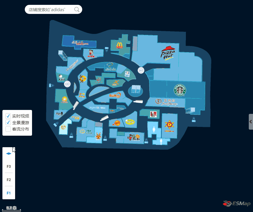 通过商场管理系统的相应界面,商场管理者可实时获取商场的人流数据、人流密度的热力分布、可实时查看商场各处的视频监控信息、安保人员的实时位置信息及运动轨迹。针对突发状况可以即时调度、快速处理。还可以依据大数据分析周边业态情况,为制定运营策略提供数据支持等。